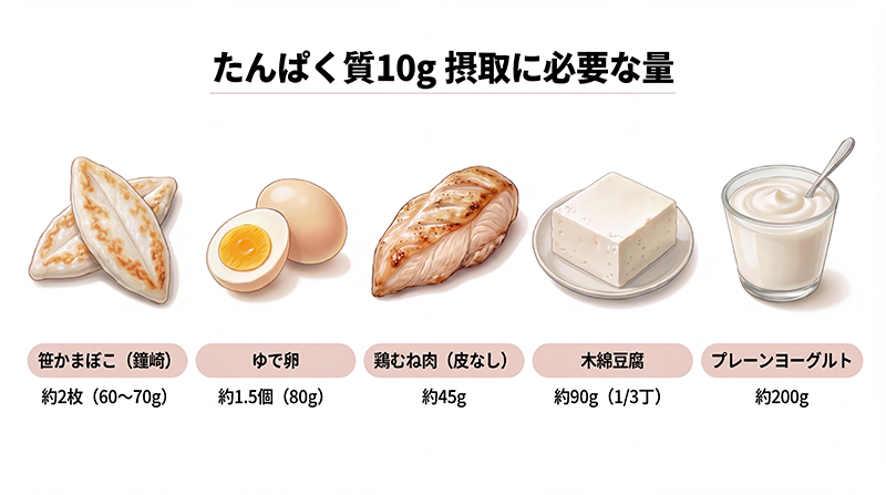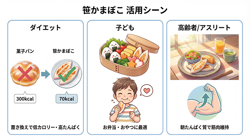 例として、朝に笹かま1〜2枚をプラスするだけで、1日全体のたんぱく質摂取量を約10%引き上げることができます。脂質や糖質を過剰に増やすことなく「たんぱく質中心の食事バランス」を整える入口として理想的で