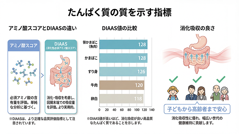 この観点で見ると、魚肉たんぱくはDIAASでも高評価とされており、かまぼこやすり身のDIASSは、それぞれ128と126と牛肉や卵白に匹敵する品質を持ちます。すなわち、笹かまぼこに含まれる魚肉たんぱくは、高アミノ酸スコア×高消化吸収性という二重の強みを備えた、非常に効率的なたんぱく源といえます。
