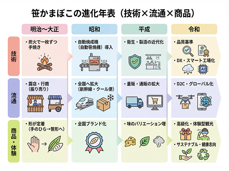 仙台の食文化を代表する笹かまぼこ。その姿は時代とともに大きく進化してきました。明治から令和へと、笹かまぼこがどのように広まり、どのように変化してきたのかを、わかりやすくご紹介します。
