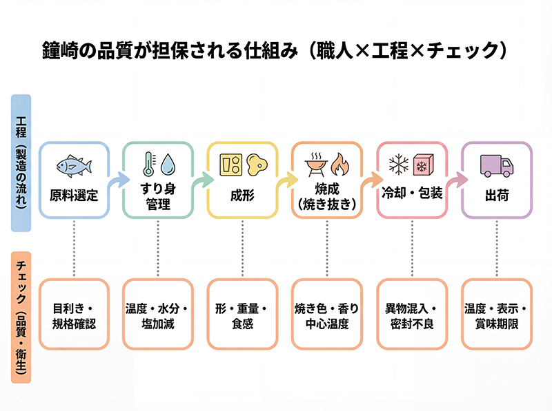 工場内は常に清潔な環境を保ち、最新設備による衛生管理を徹底。しかし機械任せにはせず、最終チェックは人の目と職人の経験に委ねることで、「鐘崎品質」を守り続けています。